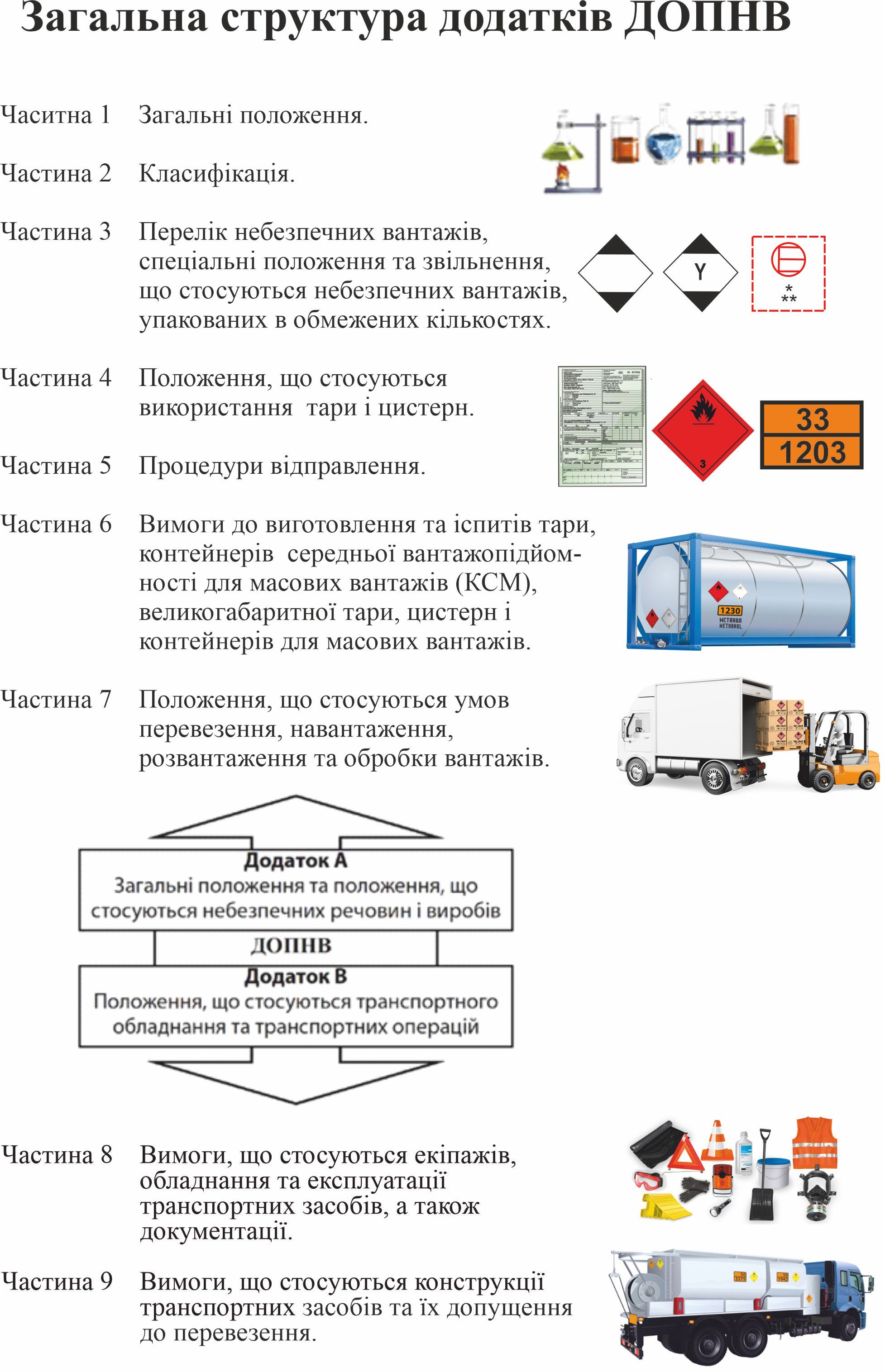 ⦁ вимог, передбачених у додатку В, що стосуються конструкції і обладнання транспортних засобів, що перевозять небезпечні вантажі, а також вимог до руху таких транспортних засобів.